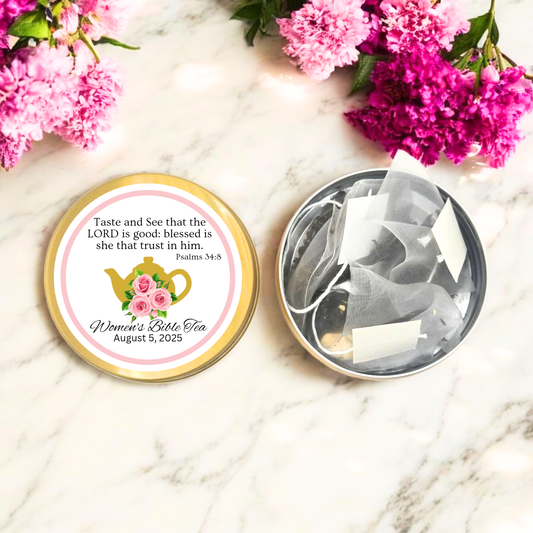 Make your celebration unforgettable with our Bible Verse Tea Tin Favors—charming, faith-filled gifts perfect for weddings, bridal showers, baby showers, or any heartfelt gathering. Each tea tin is beautifully wrapped and includes premium pyramid tea sachets and a custom Bible verse label, making every sip a gentle reminder of God’s goodness. Whether you're thanking guests or sharing a moment of encouragement, these keepsake tins offer a blend of warmth, flavor, and faith—crafted to bless every heart they reach.