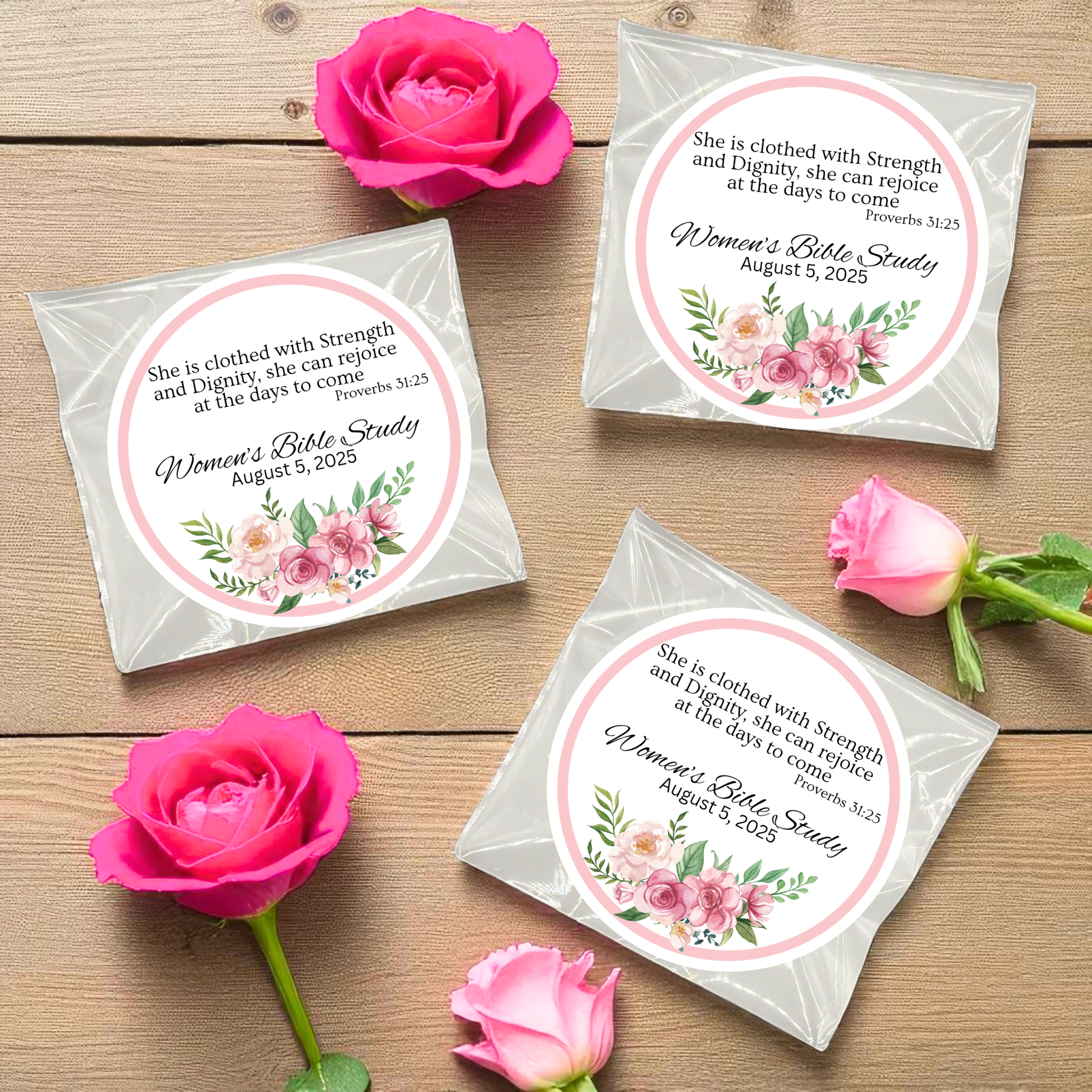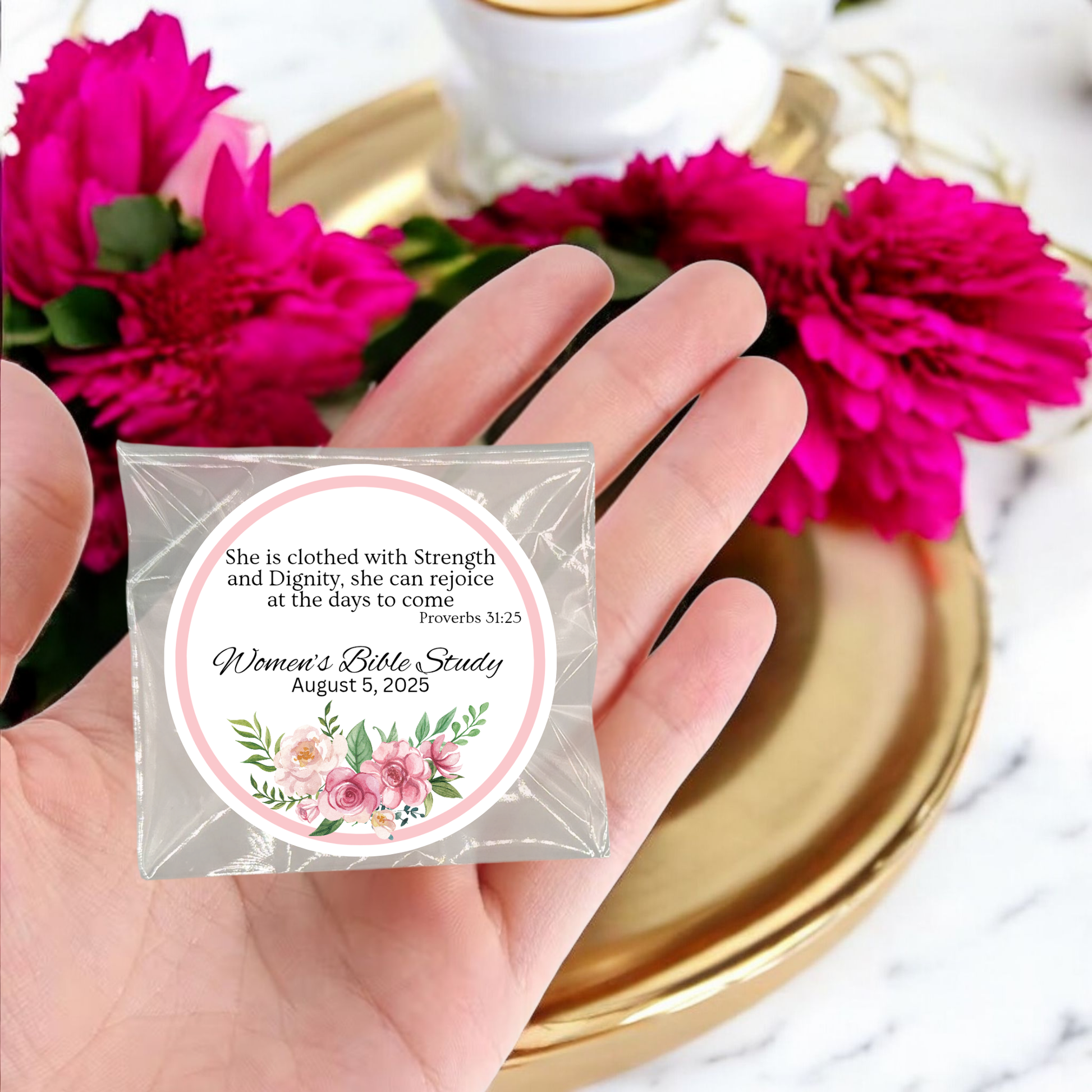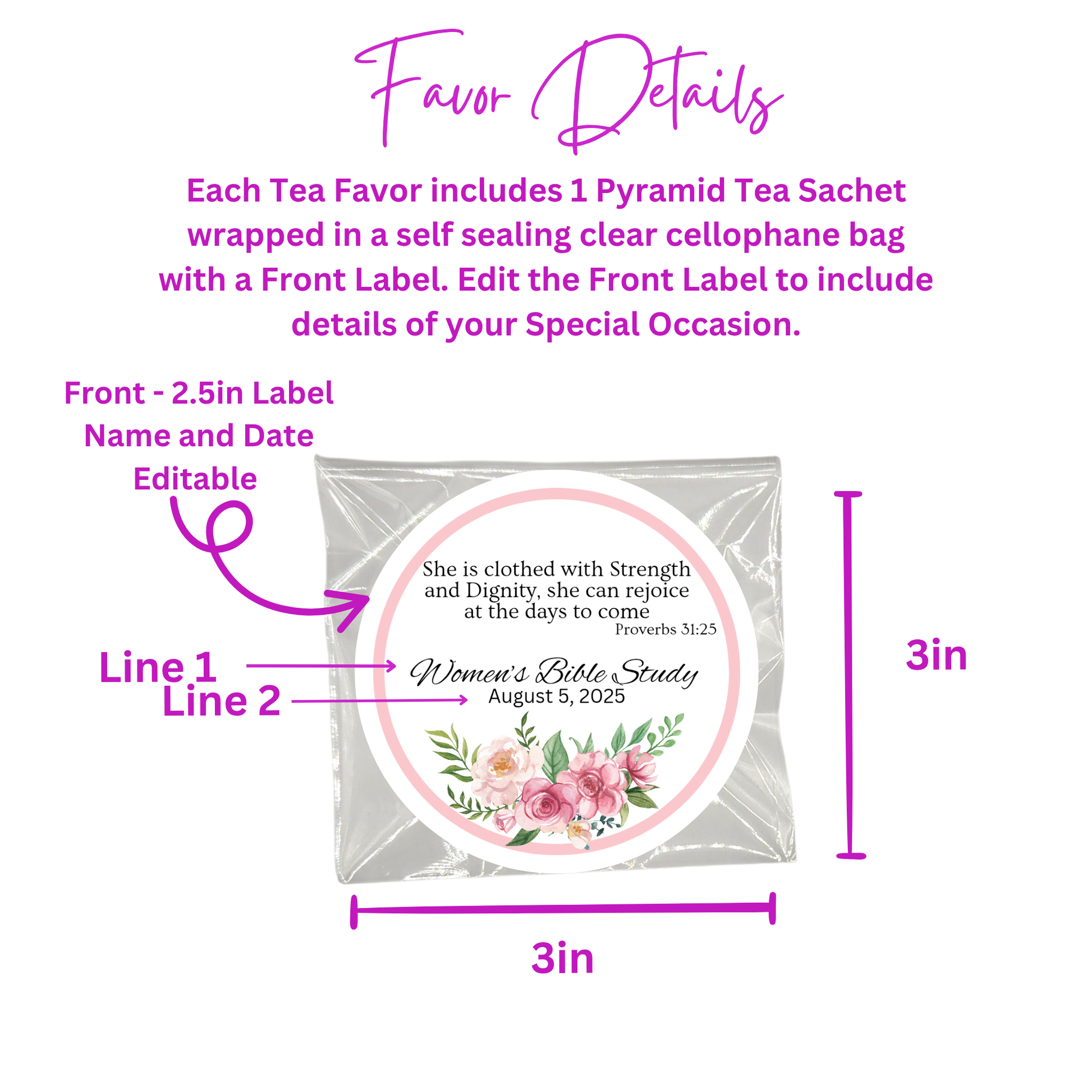 Elevate your next ladies tea party or ladies Bible study with meaningful tea favors that combine scripture, warmth, and hospitality. Wrapped in a clear bag, each favor includes one premium tea sachet and a personalized Bible verse label featuring your event name, date, and Proverbs 31:25. These are perfect for a brunch event, ladies Bible tea, or womens fellowship gathering.