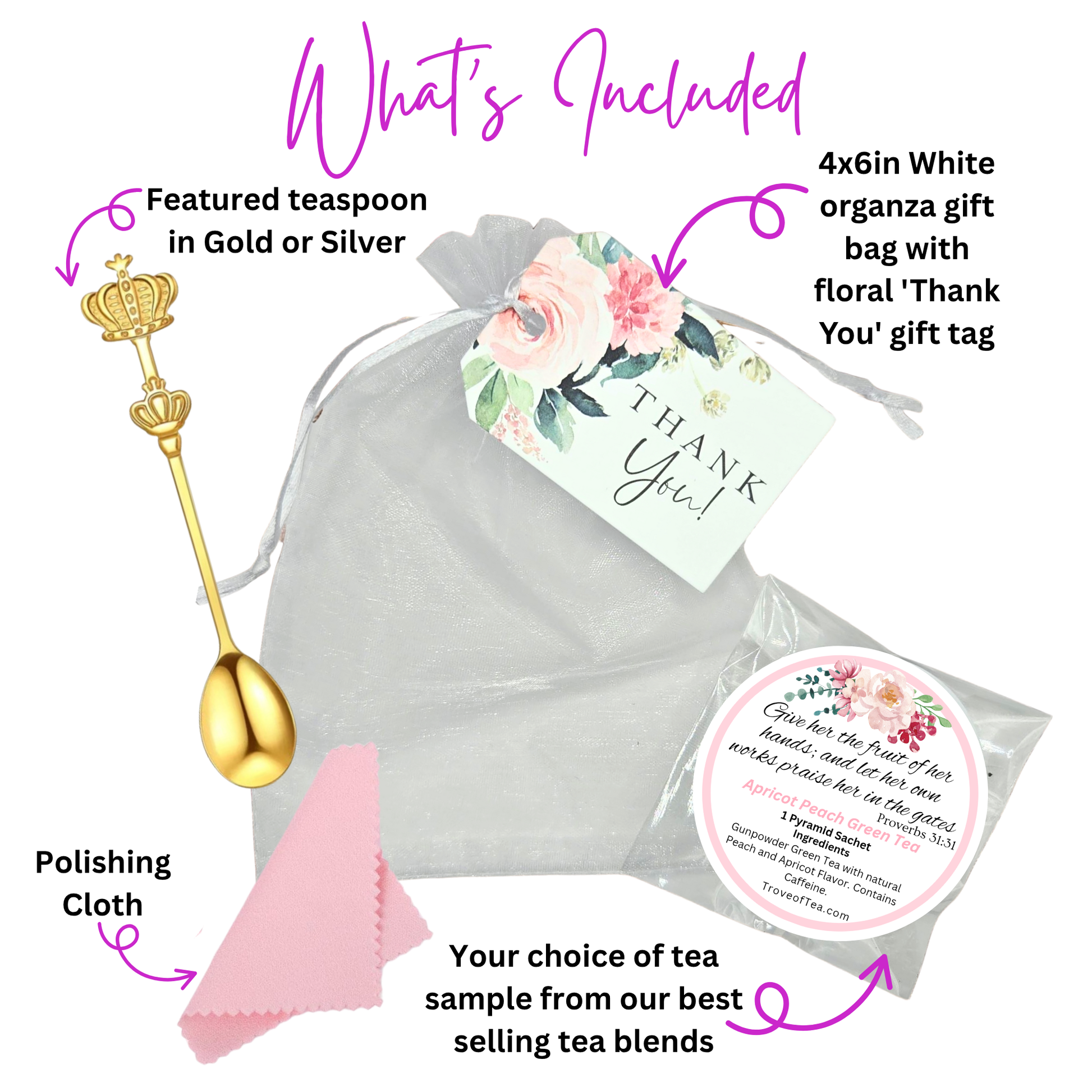 Designed with a regal crown motif, it brings charm to your wedding table decor, adds refinement to a rustic table setting, and functions perfectly as a teaspoon for tea, spoon for iced tea, or display accent. Each spoon is thoughtfully packaged with an elegant tea sachet and a Bible verse label, blending beauty and meaning into one gift.