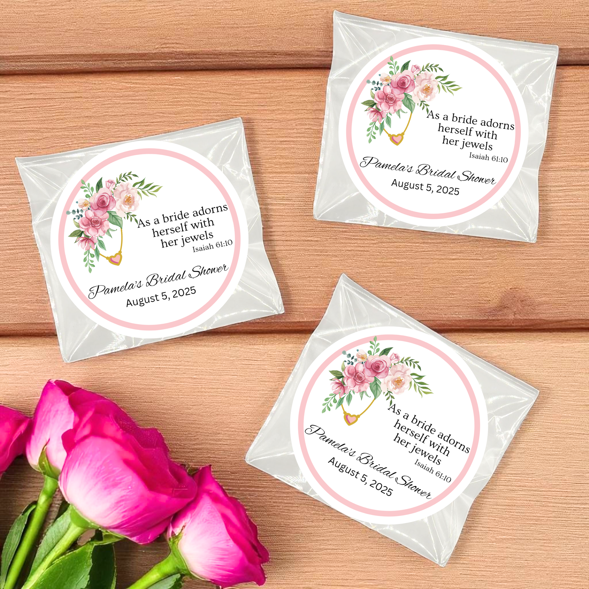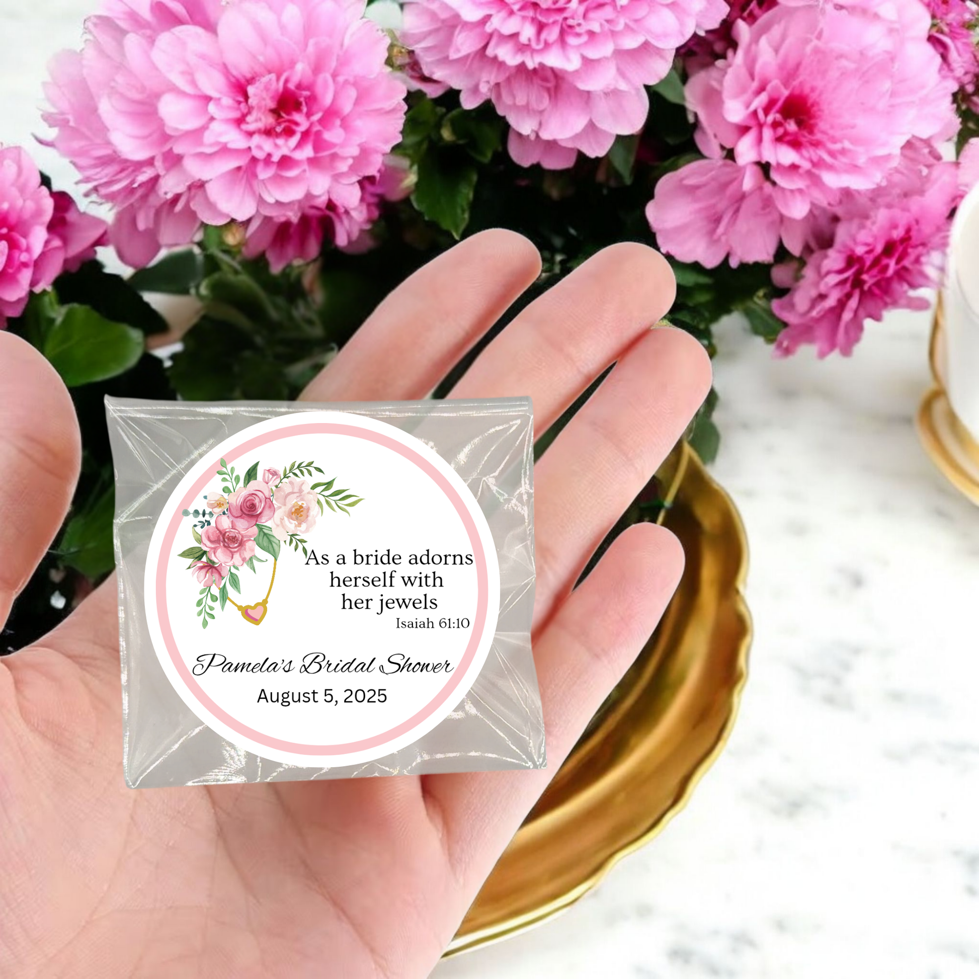 Celebrate the bride-to-be with thoughtful bridal shower favors that blend elegance, faith, and flavor. Wrapped in a clear bag and finished with a soft, personalized label, each favor features the bride’s name, shower date, and the uplifting Bible verse Isaiah 61:10. These make beautiful keepsakes for any bridal shower brunch, bridal tea party, or wedding shower celebration.
