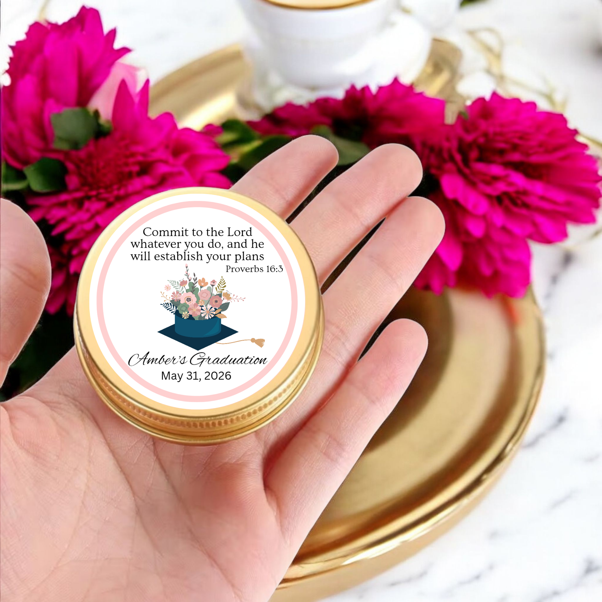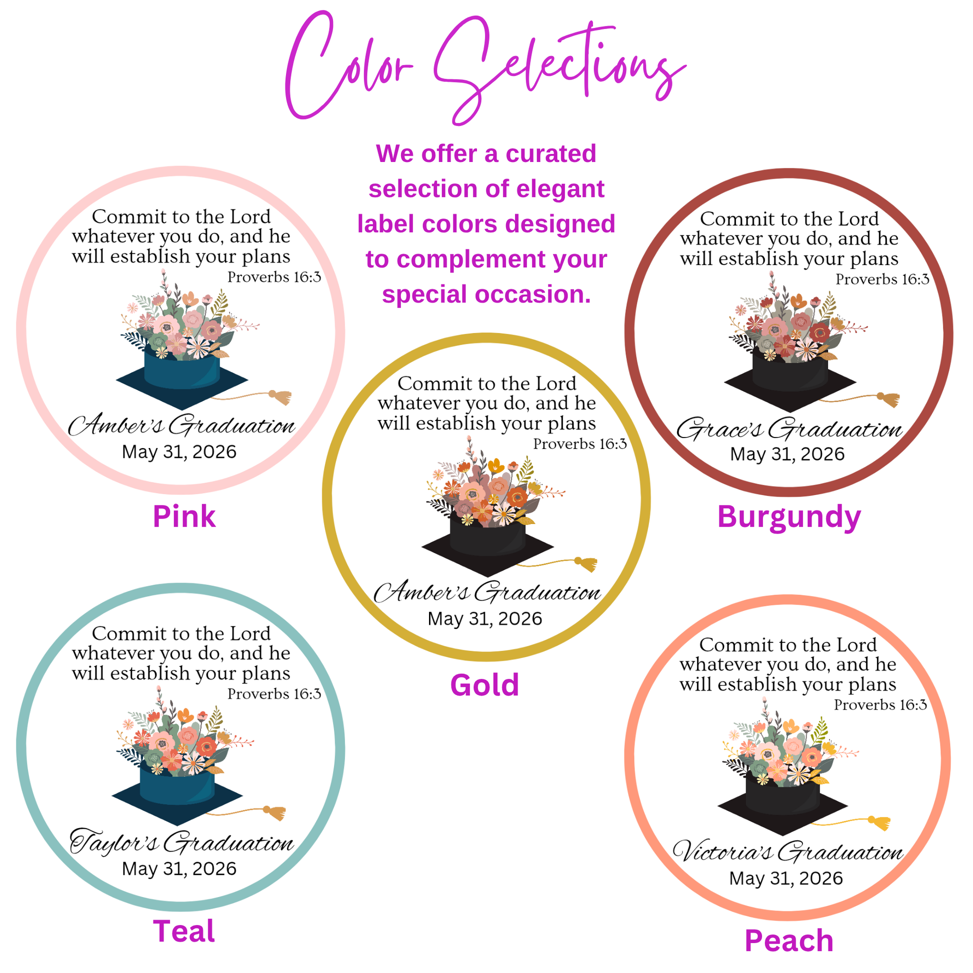 💌 Custom Faith-Filled Label - Each includes the graduate’s name, date, and Bible verse Proverbs 16:3—ideal for a custom grad party or thank you favors that inspire.