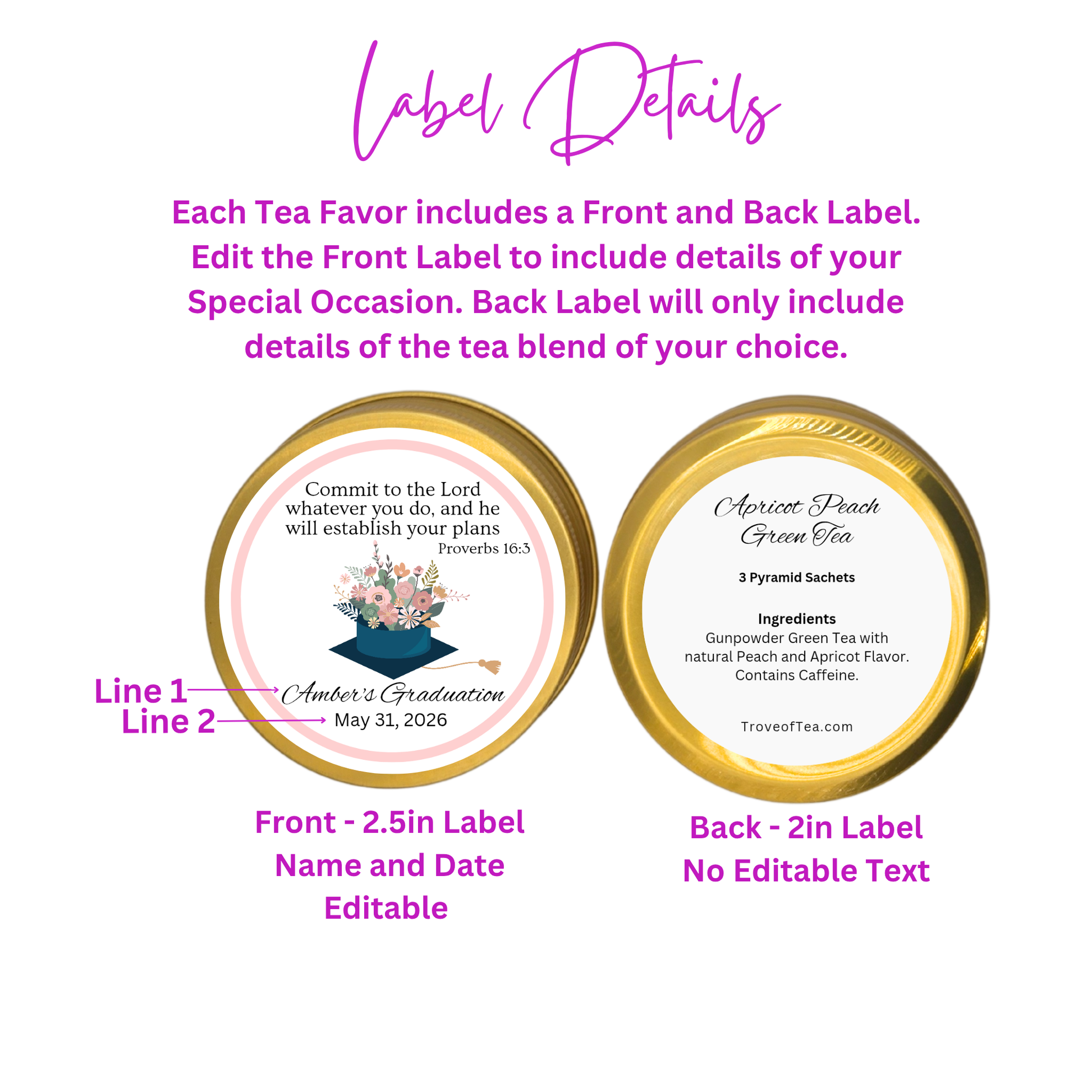 Mark new beginnings with this Bible-based Graduation Tea Favor—a meaningful, elegant gift for honoring a high school grad, college grad, or doctorate graduation milestone. Perfect for a graduation tea party, this favor blends faith and functionality with a beautiful label and premium tea favors.