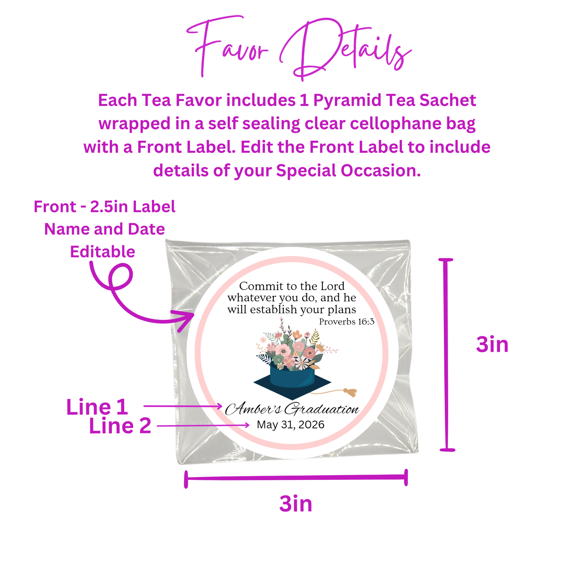 Honor a special milestone with these thoughtful Graduation Tea Favors, perfect for a graduation tea party, custom grad party, or as heartfelt thank you favors. Each favor includes one premium tea sachet wrapped in a clear bag with a personalized label featuring the graduate’s name, date, and Bible verse Proverbs 16:3—creating a meaningful gift that celebrates both achievement and faith.