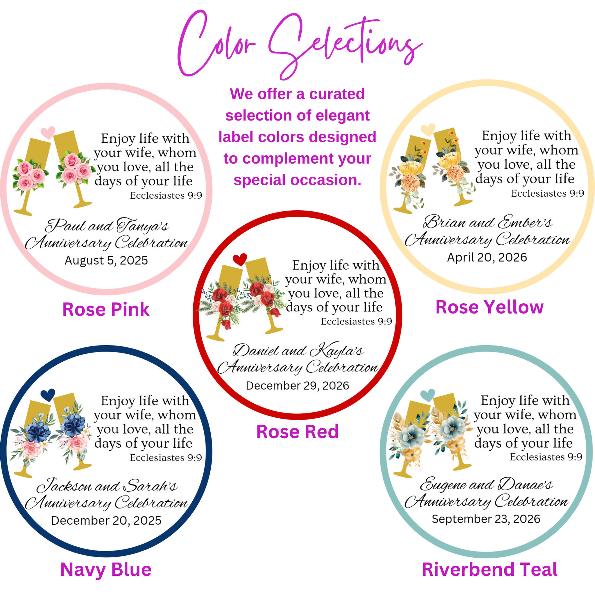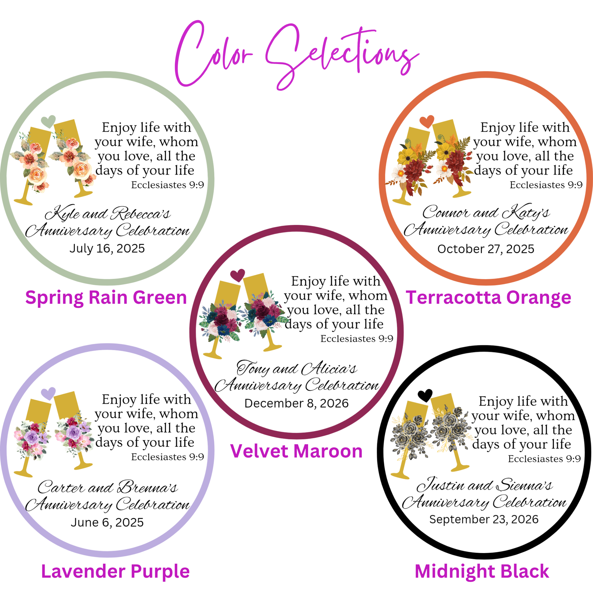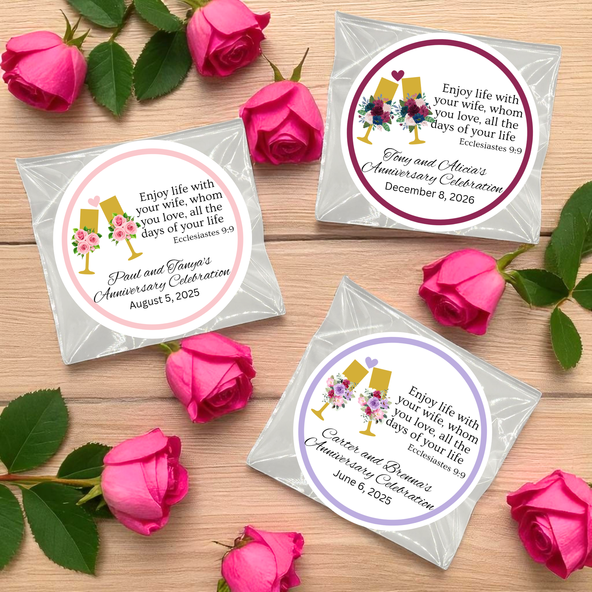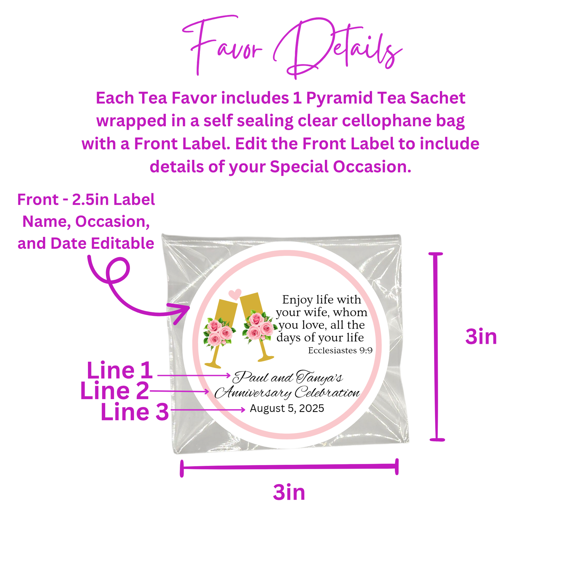 Add grace and warmth to your anniversary party or vow renewal with these elegant tea favors. Each favor features one premium hot tea bag, wrapped in a clear bag and topped with a custom label that includes the couple's names, date, and a heartfelt Bible verse—Ecclesiastes 9:9. A perfect personalized gift to celebrate love with intention, whether you're hosting a small dinner or a full wedding reception.