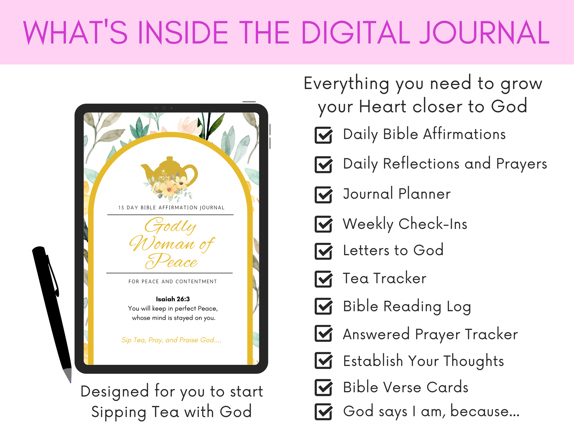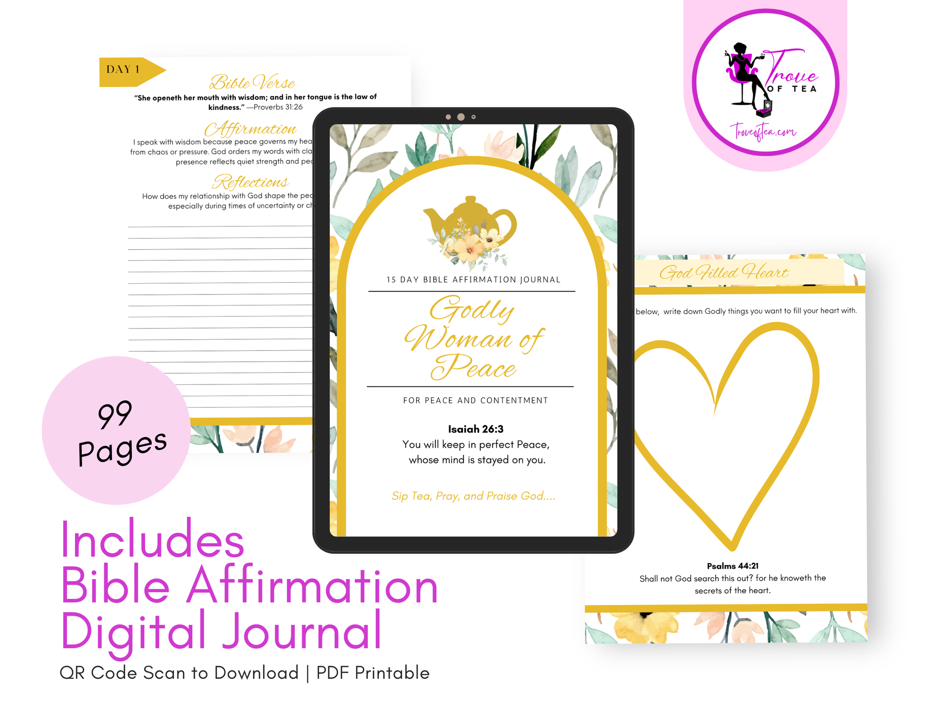 💻 15 Day Bible Affirmation Digital Journal (99 pages) - A beautifully designed faith-based reflection companion featuring daily Scripture prompts, prayer space, journaling pages, and intentional tea moments to help you examine your heart, remove distractions, and realign your devotion fully to God.