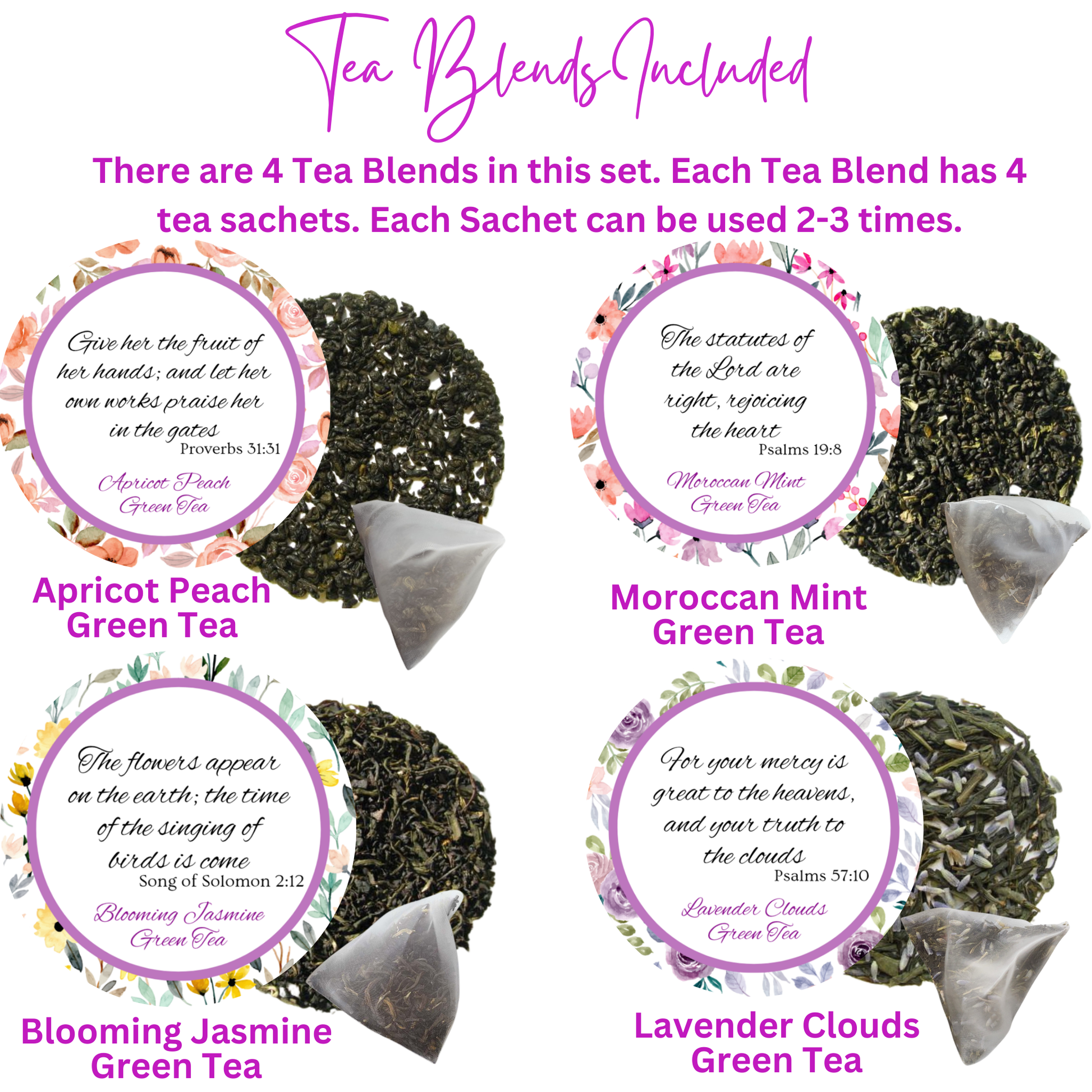🌿4 Bible Verse Tea Tins (16 Sachets) - A delightful variety of premium Green teas to spark your tea-tasting adventure. There are 4 pyramid tea sachets in each tin. Each pyramid sachet can be used 2-3 times.