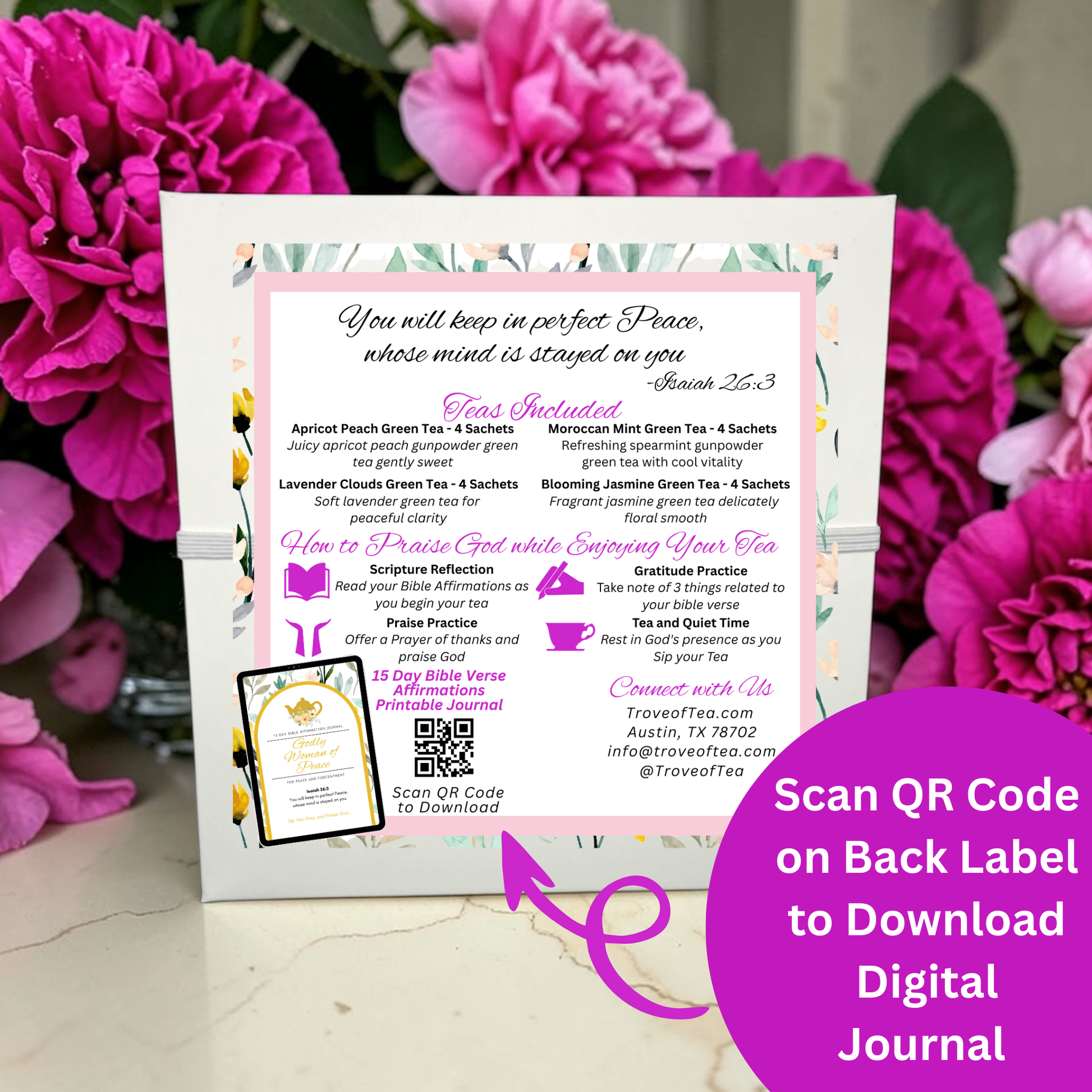Find stillness in every steep with our Godly Woman of Peace Green Tea Sampler Gift, a refreshing Green tea gift thoughtfully curated to inspire calm, clarity, and sacred reflection. This elegant green tea gift box features 4 beautifully crafted bible verse tins filled with premium flavored green tea, including soothing Lavender tea bags, refreshing spearmint tea bags, delicate peach tea, and blooming jasmine tea bags, each carefully prepared as part of this uplifting tea sampler set. Designed as a meaningful green tea gift set, it pairs perfectly with a coordinating digital Devotional journal - an affirmation journal used as faith workbook and faith based journal, transforming every cup into a peaceful pause for prayer, journaling, and heartfelt worship—inviting you to sip slowly, reflect deeply, and walk confidently in the spirit of peace.