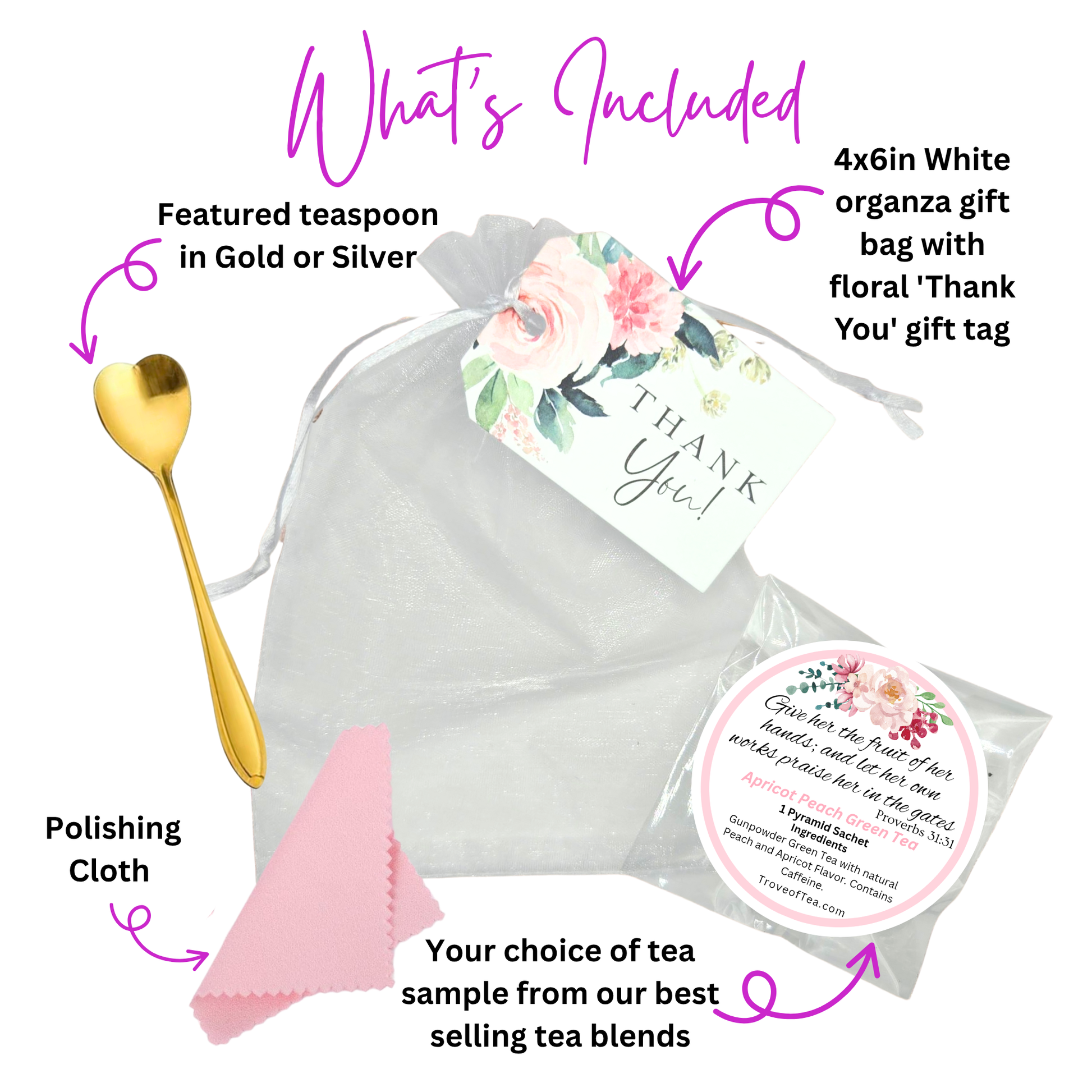 Thoughtfully crafted as heart shaped spoons, each piece comes wrapped in a white organza bag with a floral “thank you” tag, a premium tea sachet with inspiring Bible verse. Whether you're looking for personal use, creating a tea party gift bag, styling a bridal shower table, or designing table decor for a wedding reception, this spoon adds grace and meaning to every setting.