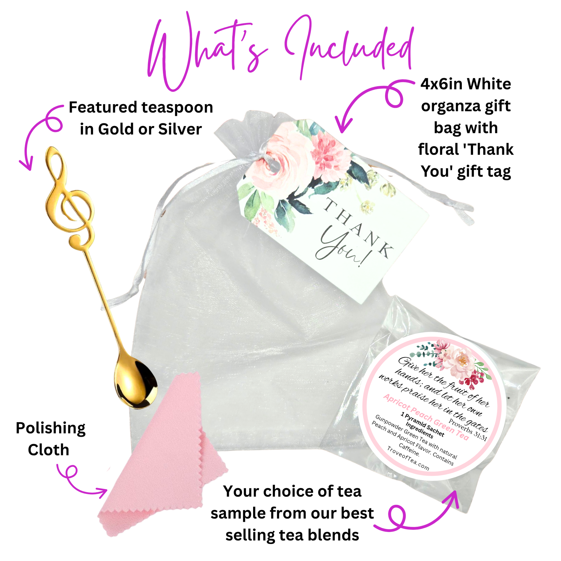 Spoon are wrapped in organza gift bags and gift tags paired with a premium tea sachet and a Bible verse label, creating a keepsake that uplifts and inspires. Use it as a favor tea spoon for occasions, showers, or receptions—it’s more than just gold cutlery; it’s a cherished reminder of gratitude and grace.