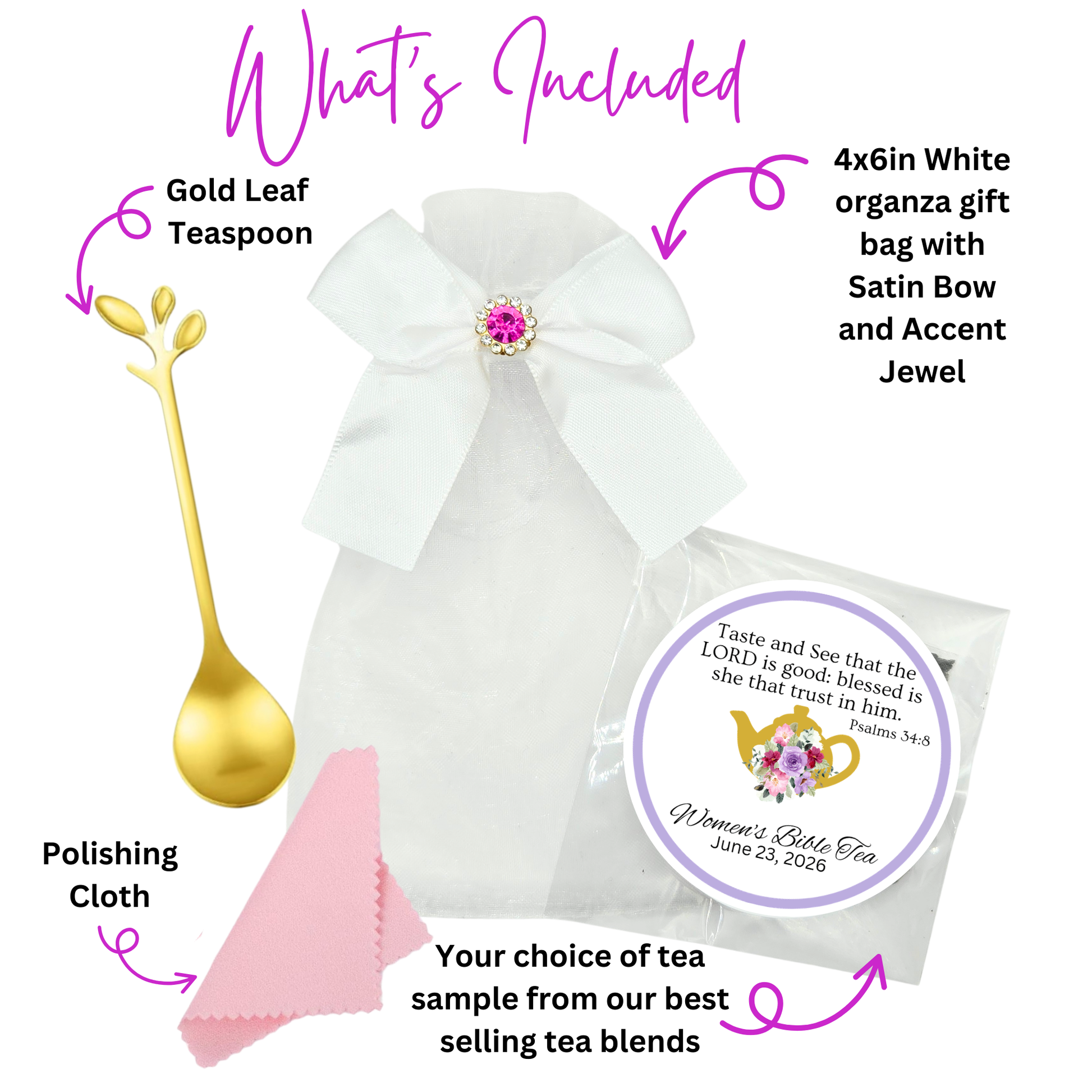 Add charm and elegance to your table with our Leaf Tea Spoon Scripture Tea Favors—beautiful keepsakes perfect for bible study gifts for women, spiritual retreat, and prayer gatherings. This stunning gold leaf tea spoon enhances any table setting décor and can be used as a tea party spoon, coffee spoon, or charming ice cream spoon for refined events. Each favor is thoughtfully presented in an organza bag with an accent jewel and paired with a premium tea sachet featuring your choice of personalized Bible verse label. Perfect for bulk event favors, bible studies, ladies tea parties, and meaningful celebrations, these elegant spoons blend faith, beauty, and purpose—creating timeless keepsakes your guests will cherish and use.