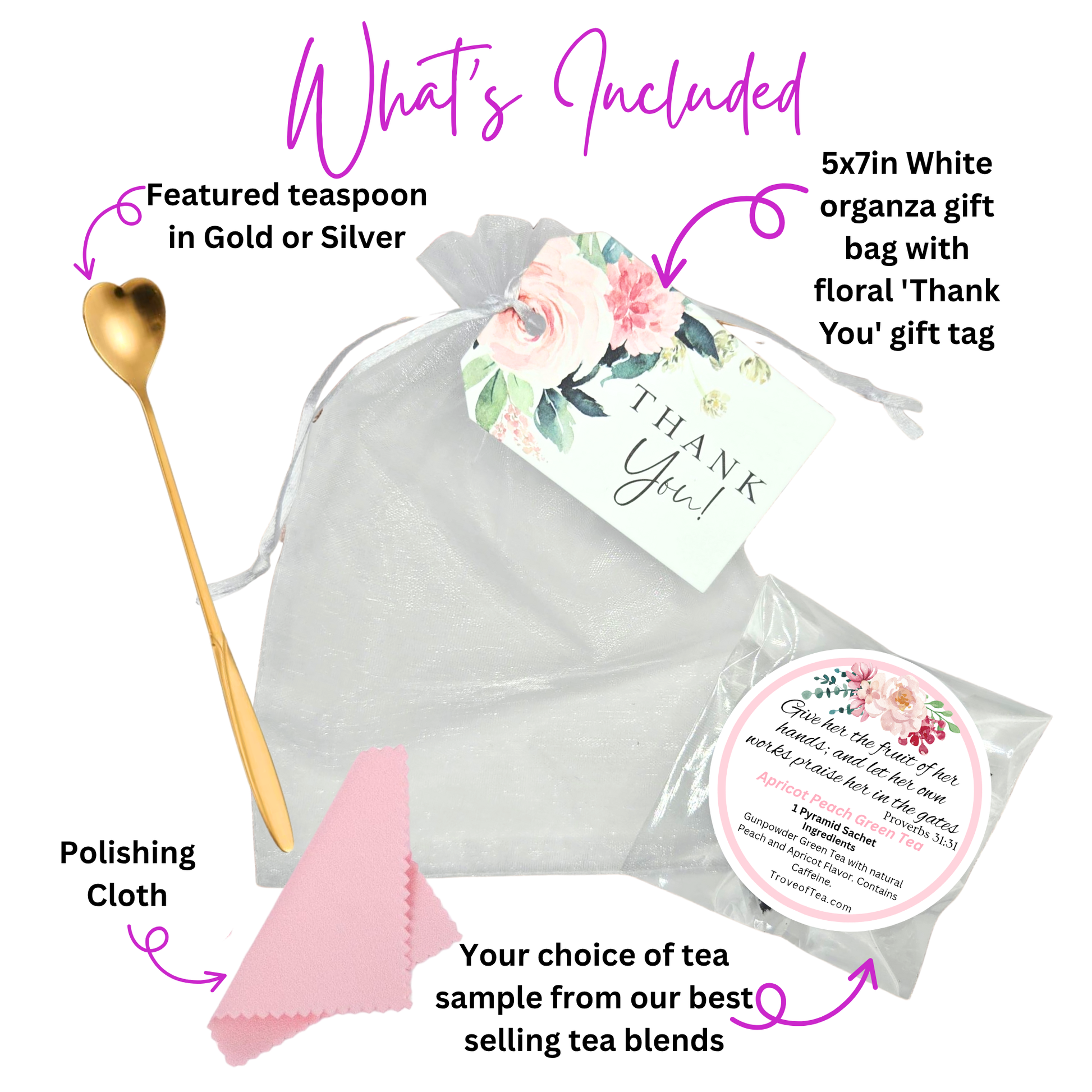 Each Favor comes in your choice of either 🎨 Gold or Silver. Each favor comes with your choice of ☕️ Tea Sample.