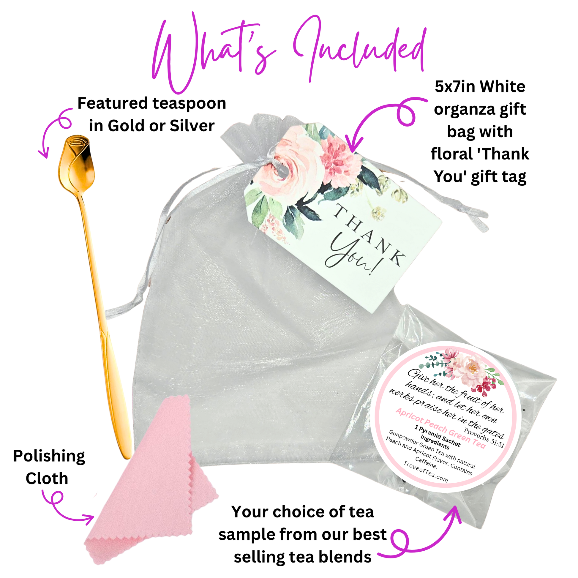 Each Favor comes in your choice of either 🎨 Gold or Silver. Each favor comes with your choice of ☕️ Tea Sample.