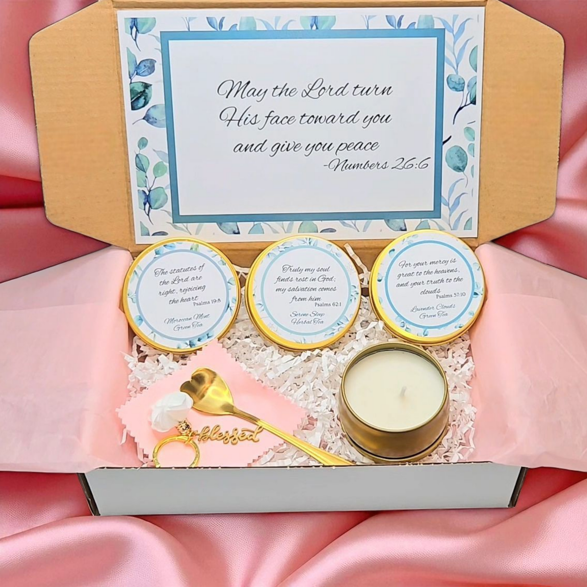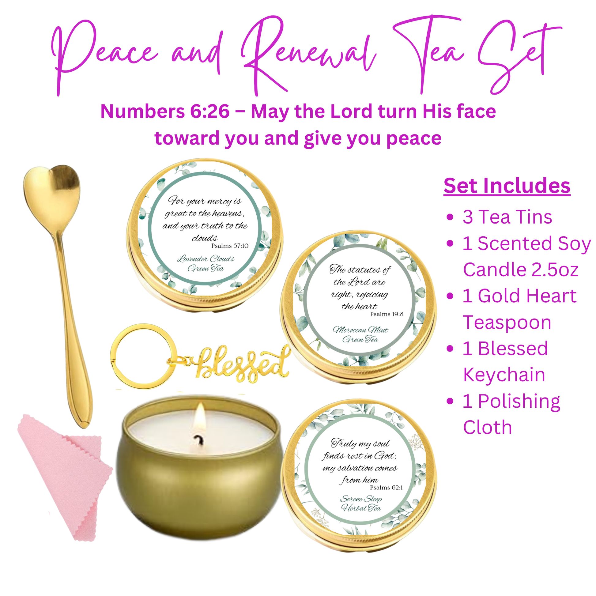 Find rest for your soul with our Peace and Quiet Bible Verse Tea Set—a serene Bible tea gift box created to bring peace and rest to the heart of a godly woman. This comforting gift includes 3 calming tea tins in soothing herbal tea and refreshing green tea, a natural soy scented candle, a gold heart teaspoon, and an inspirational keychain—each item selected to encourage her to rest in God and trust His plan.