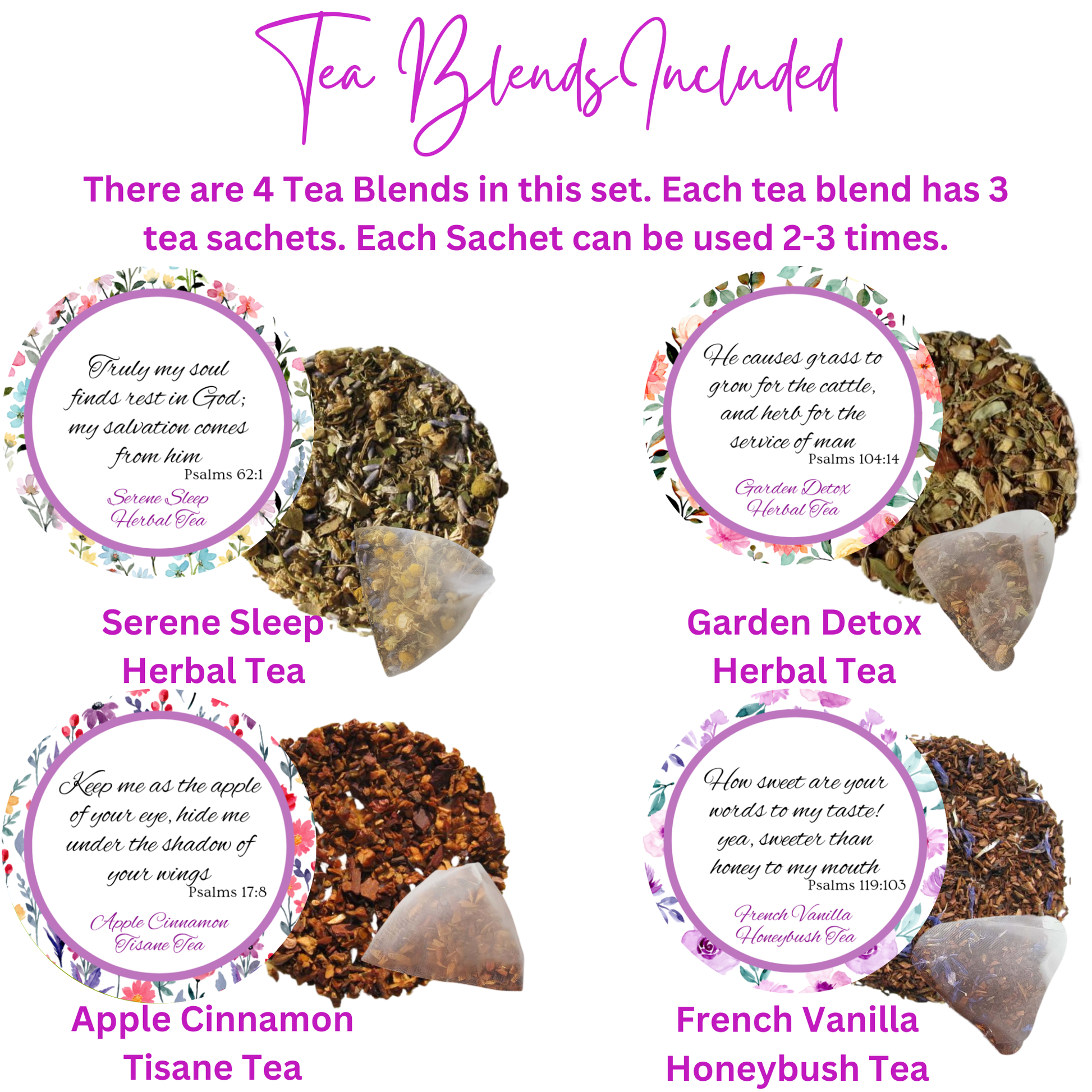 🌿4 Bible Verse Tea Tins - A delightful variety of Herbal teas to spark your tea-tasting adventure. There are 3 pyramid tea sachets in each tin. Each pyramid sachet can be used 2-3 times.