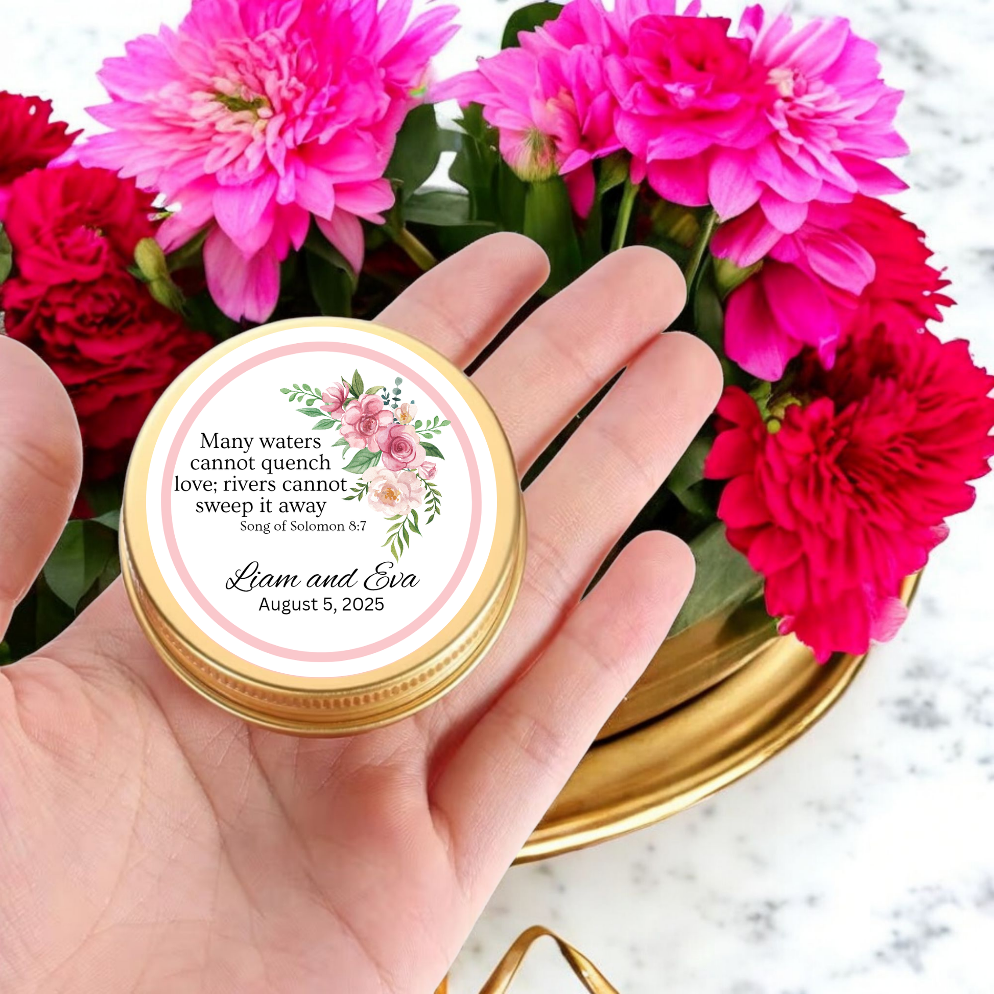 💌 Custom Party Favors with Bible Verse - Each favor includes a personalized label with the couple’s names, date, and Bible verse Song of Solomon 8:7 —ideal custom party favors for faith-filled engagement gifts or charming wedding favours.