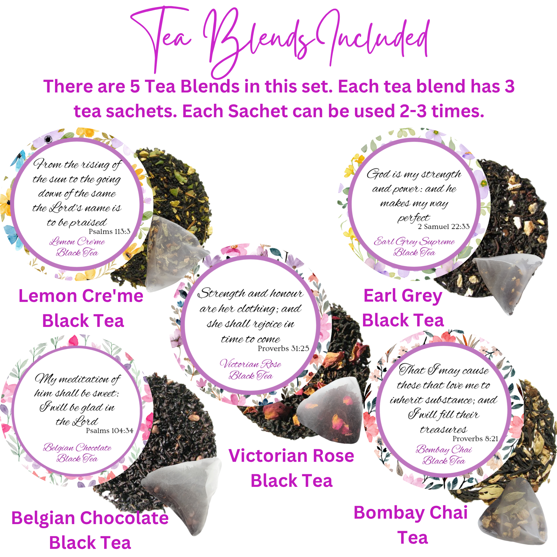 Experience boldness in every sip with our Strength and Honor Black Tea Sampler—a powerful blend of strength and serenity for your daily moments of reflection. This scripture verse sample tea set includes 5 premium black tea tins, carefully selected for those who love rich flavor and those exploring the world of loose leaf tea bags for the first time. Inspired by Proverbs 31:25 ”She is clothed with Strength and Dignity; she can laugh at the days to come". — this tea sampler gift brings the beauty of bible and tea together in one scripture gift designed to uplift and encourage.