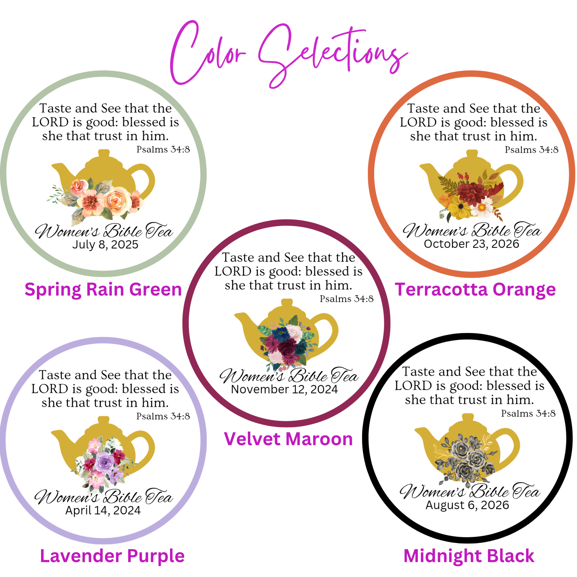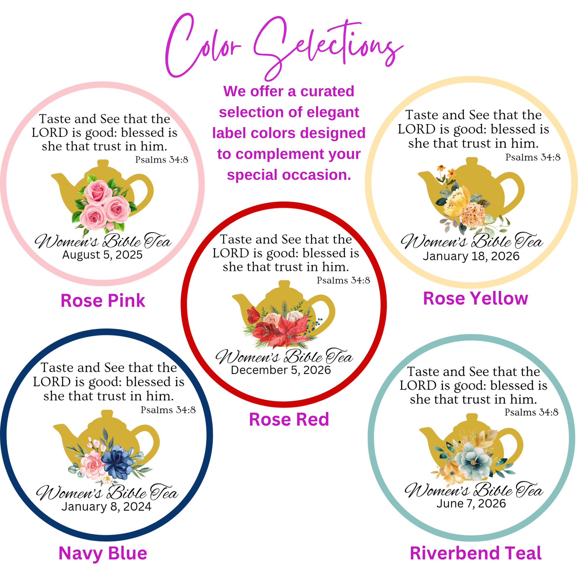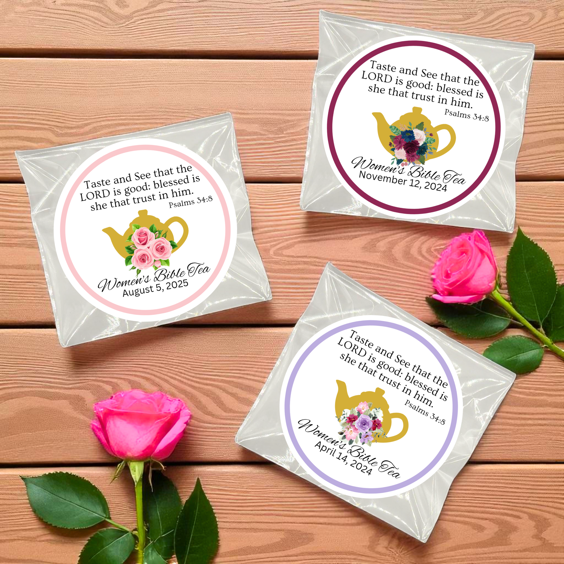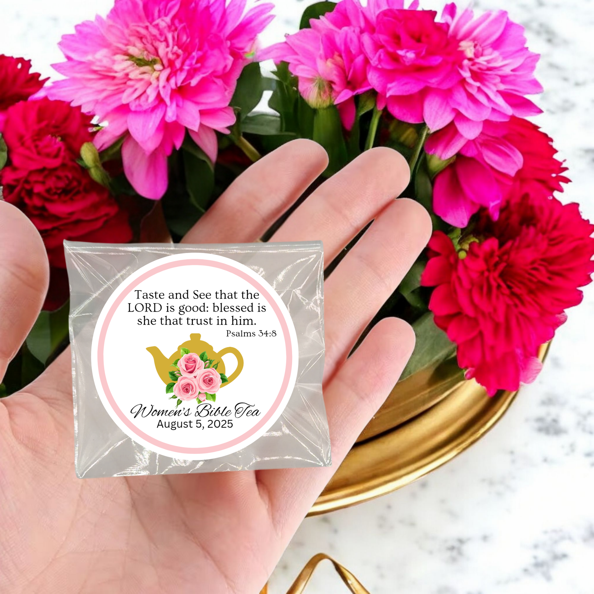 Celebrate faith, connection, and wellness with these elegant Bible Study Tea Favors—a thoughtful gift for any ladies tea, Bible tea party, or wellness retreat. Each favor is wrapped in a clear bag and includes one premium tea sachet, along with a personalized label featuring your event name, date, and the uplifting Bible verse Psalm 34:8. These are ideal customized favors for sharing encouragement and gratitude.