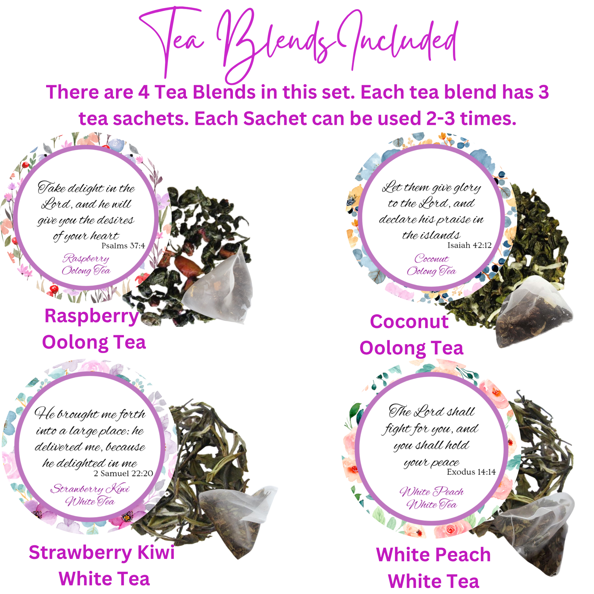 🌿4 Bible Verse Tea Tins - A delightful variety of Oolong and White teas to spark your tea-tasting adventure. There are 3 pyramid tea sachets in each tin. Each pyramid sachet can be used 2-3 times.